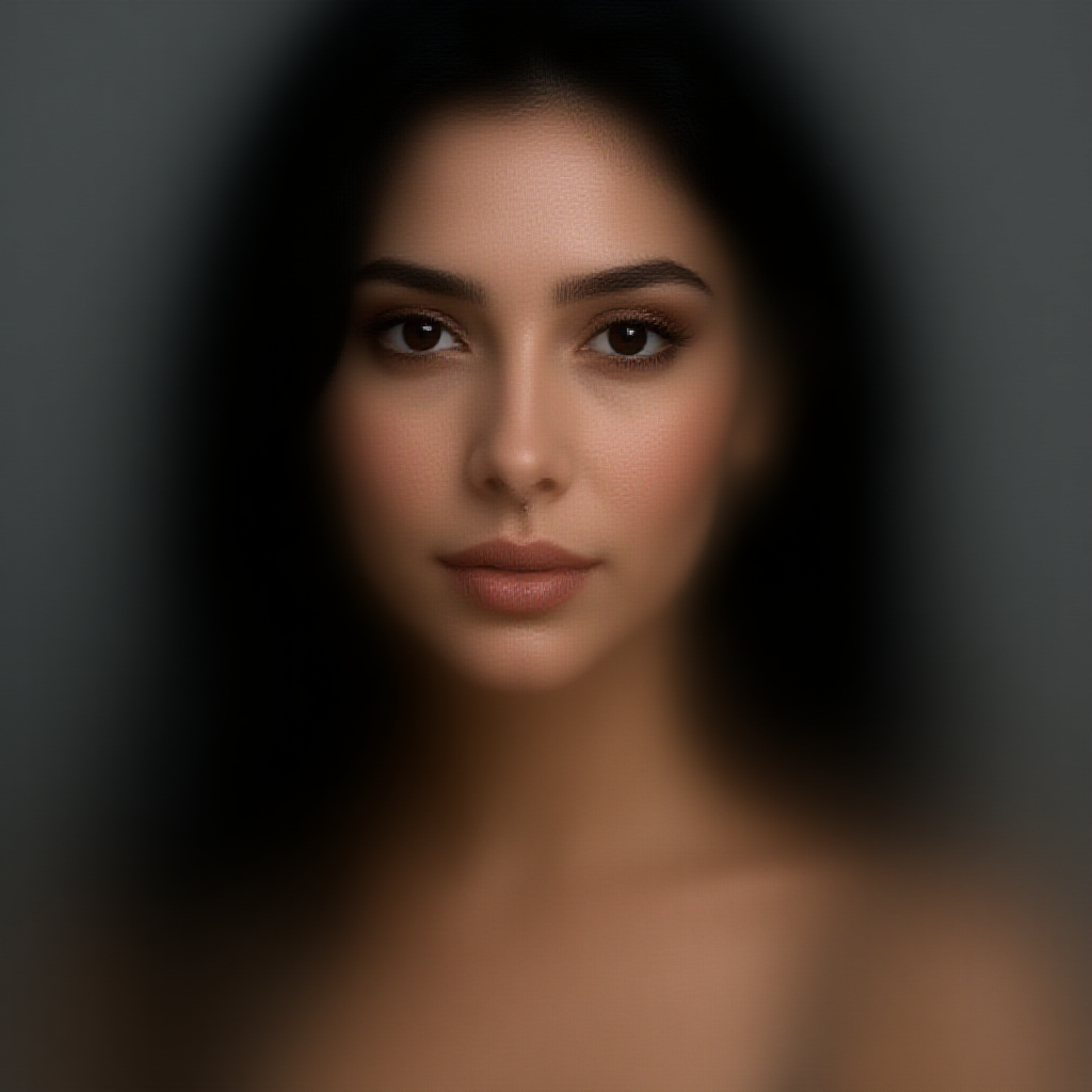 Gorgeous woman with dark hair gazing at the viewer, capturing a captivating portrait with realistic detail. The photograph emphasizes her intricate skin texture, capturing her beauty in a photo-realistic 8k resolution. A full-length frame highlights her elegance, complemented by a subtle piercing that adds character. The scene is bathed in diffused soft lighting, with a shallow depth of field ensuring a sharp focus on her features. The hyperrealistic elements are enhanced by cinematic CGI lighting, creating a lifelike, doll-like quality rendered with precision akin to 3D octane techniques. All aspects of the frame exude high quality, with attention to anatomy and proportions, ensuring the portrayal is accurate and lifelike, showcasing perfect harmony and correctness in every detail.