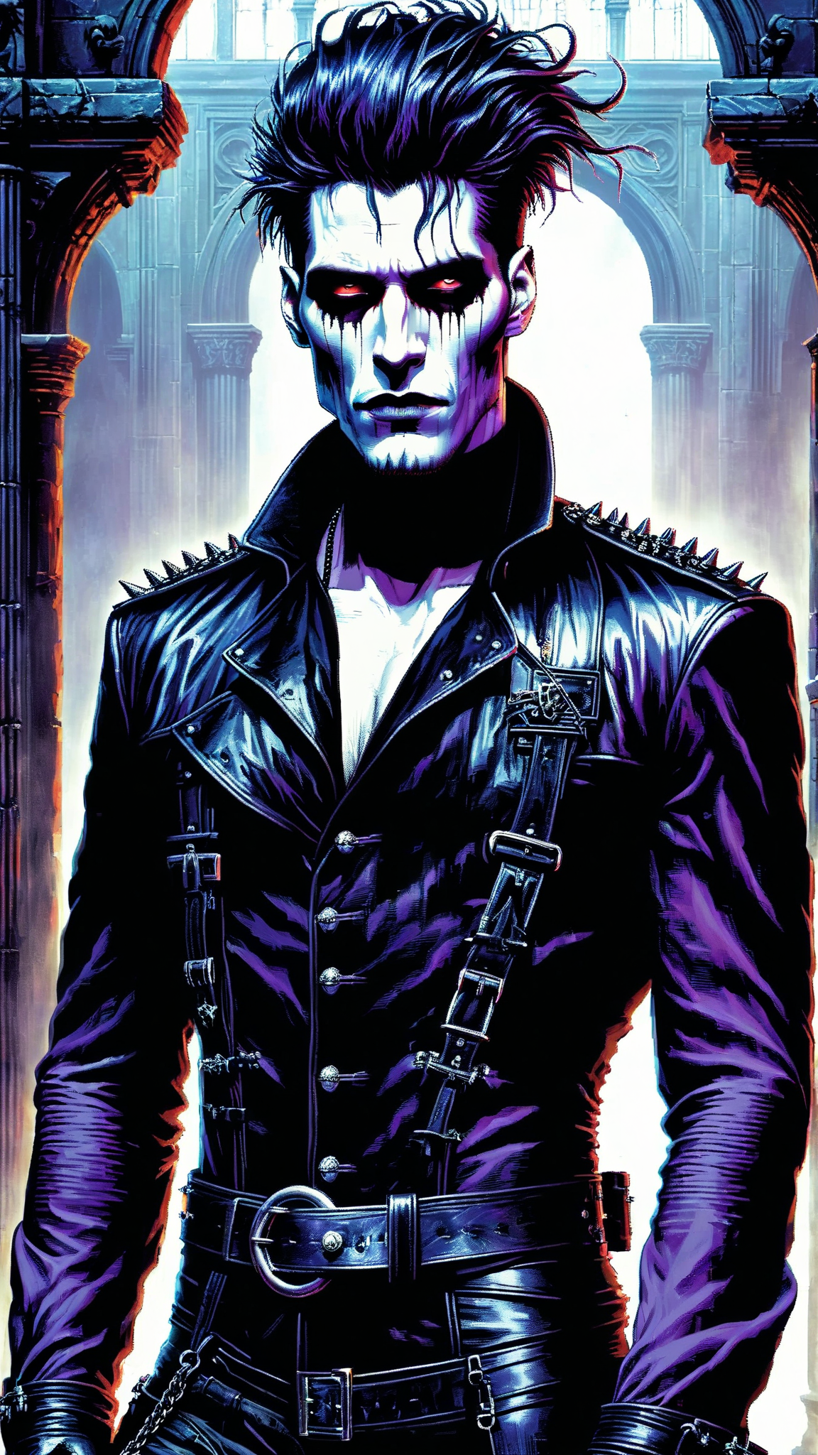 Goth Punk visits Hammer Horror films. Dark, creepy, Goth, sado-masochism. He can turn invisible and follow people around. He also has the ability to enter their minds and scare them to death. He can also siphon off little bits of life force and energy from his victims---most of the time he kills them. A young Caucasian man in his 20s, his skin is chalk white, he's becoming more undead as time goes by. He has dark circles around his eyes, but he also wears Goth makeup. Very tall, thin, lithe but strong, sinewy. Emo style hair, shaved on the sides and back, long on top and falls over one eye-- the top is dyed eggplant purple. Strong brow and jaw, masculine and handsome, though he does have a slight resemblance to Frankenstein's monster--- he takes pride in that. His eyes are grey and intense, like he's staring into your soul. Because he is tall, he has very big hands with long fingers. He wears the latest in Goth fashion: black leather choker collar with spikes, sheer black see-thru form fitting long sleeved shirt, o-ring black leather harness, black leather bracers with spikes on his arms, dark Violet leather jeans, heavy black leather engineer boots. Full body pose, hanging out in a graveyard or dark Goth Punk club.