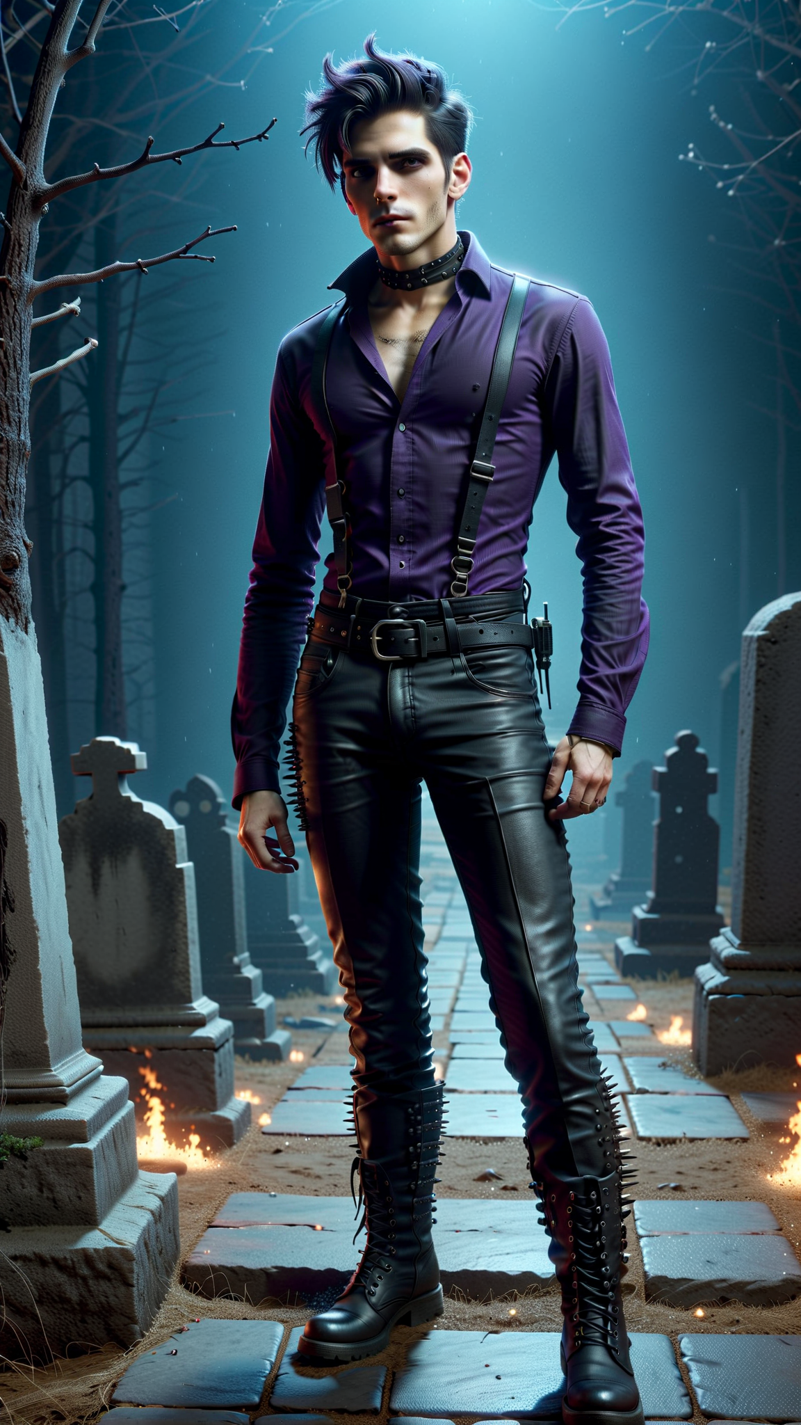 Goth Punk visits Hammer Horror films. Dark, creepy, Goth, sado-masochism. He can turn invisible and follow people around. He also has the ability to enter their minds and scare them to death. He can also siphon off little bits of life force and energy from his victims---most of the time he kills them. A young Caucasian man in his 20s, his skin is chalk white, he's becoming more undead as time goes by. He has dark circles around his eyes, but he also wears Goth makeup. Very tall, thin, lithe but strong, sinewy. Emo style hair, shaved on the sides and back, long on top and falls over one eye-- the top is dyed eggplant purple. Strong brow and jaw, masculine and handsome, though he does have a slight resemblance to Frankenstein's monster--- he takes pride in that. His eyes are grey and intense, like he's staring into your soul. Because he is tall, he has very big hands with long fingers. He wears the latest in Goth fashion: black leather choker collar with spikes, sheer black see-thru form fitting long sleeved shirt, o-ring black leather harness, black leather bracers with spikes on his arms, dark Violet leather jeans, heavy black leather engineer boots. Full body pose, hanging out in a graveyard or dark Goth Punk club.