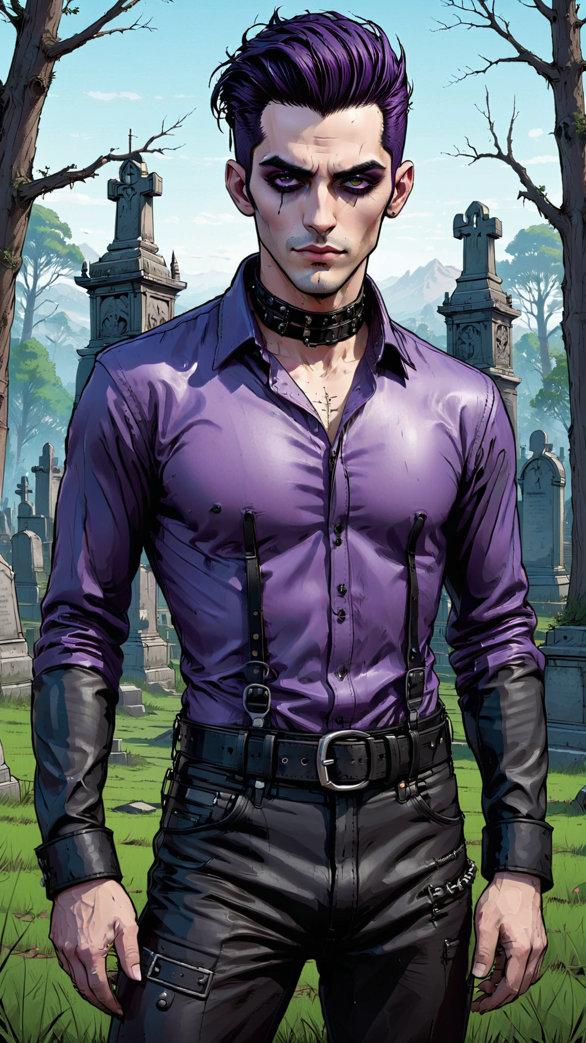 Goth Punk visits Hammer Horror films. Dark, creepy, Goth, sado-masochism. He can turn invisible and follow people around. He also has the ability to enter their minds and scare them to death. He can also siphon off little bits of life force and energy from his victims---most of the time he kills them. A young Caucasian man in his 20s, his skin is chalk white, he's becoming more undead as time goes by. He has dark circles around his eyes, but he also wears Goth makeup. Very tall, thin, lithe but strong, sinewy. Emo style hair, shaved on the sides and back, long on top and falls over one eye-- the top is dyed eggplant purple. Strong brow and jaw, masculine and handsome, though he does have a slight resemblance to Frankenstein's monster--- he takes pride in that. His eyes are grey and intense, like he's staring into your soul. Because he is tall, he has very big hands with long fingers. He wears the latest in Goth fashion: black leather choker collar with spikes, sheer black see-thru form fitting long sleeved shirt, o-ring black leather harness, black leather bracers with spikes on his arms, dark Violet leather jeans, heavy black leather engineer boots. Full body pose, hanging out in a graveyard or dark Goth Punk club.