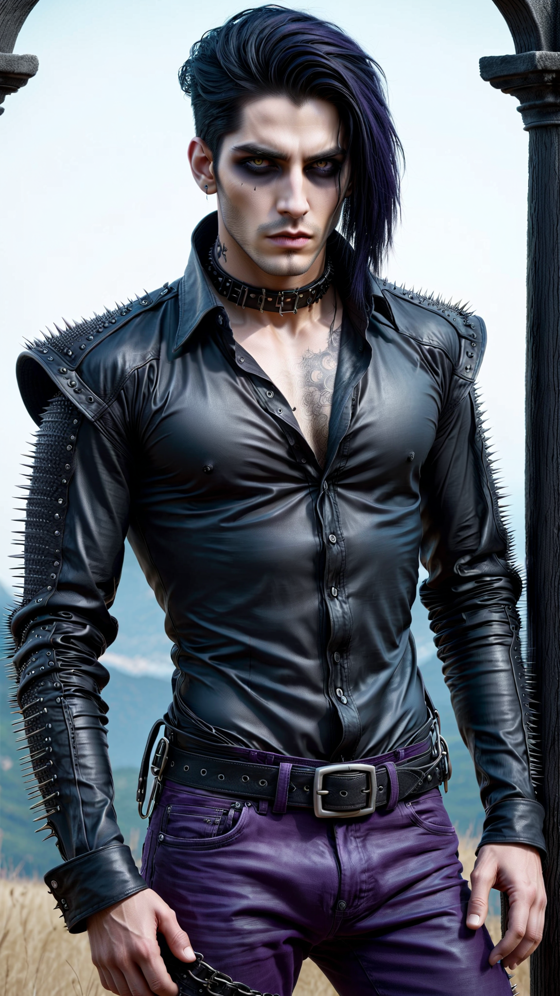 Goth Punk visits Hammer Horror films. Dark, creepy, Goth, sado-masochism. He can turn invisible and follow people around. He also has the ability to enter their minds and scare them to death. He can also siphon off little bits of life force and energy from his victims---most of the time he kills them. A young Caucasian man in his 20s, his skin is chalk white, he's becoming more undead as time goes by. He has dark circles around his eyes, but he also wears Goth makeup. Very tall, thin, lithe but strong, sinewy. Emo style hair, shaved on the sides and back, long on top and falls over one eye-- the top is dyed eggplant purple. Strong brow and jaw, masculine and handsome, though he does have a slight resemblance to Frankenstein's monster--- he takes pride in that. His eyes are grey and intense, like he's staring into your soul. Because he is tall, he has very big hands with long fingers. He wears the latest in Goth fashion: black leather choker collar with spikes, sheer black see-thru form fitting long sleeved shirt, o-ring black leather harness, black leather bracers with spikes on his arms, dark Violet leather jeans, heavy black leather engineer boots. Full body pose, hanging out in a graveyard or dark Goth Punk club.