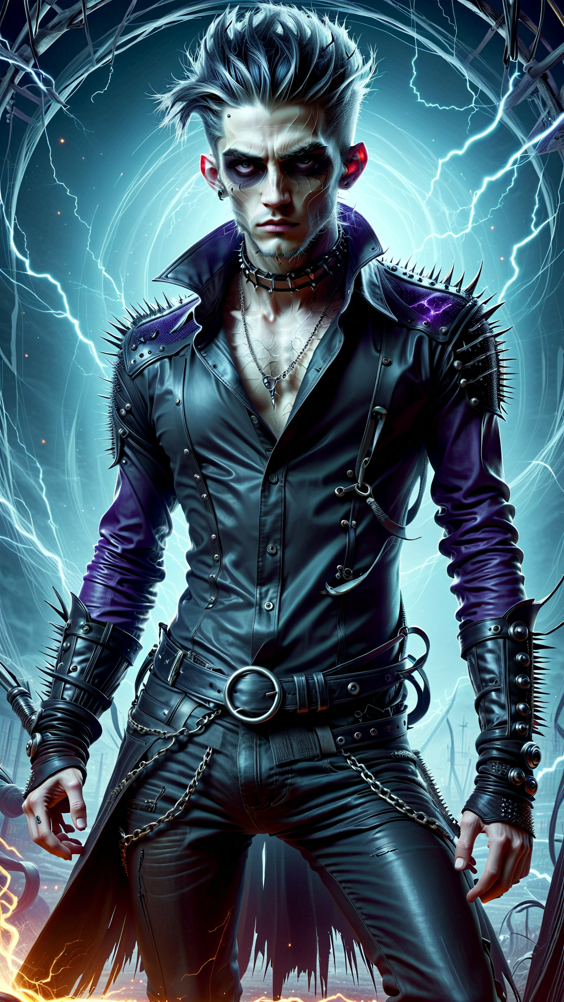 Goth Punk visits Hammer Horror films. Dark, creepy, Goth, sado-masochism. He can turn invisible and follow people around. He also has the ability to enter their minds and scare them to death. He can also siphon off little bits of life force and energy from his victims---most of the time he kills them. A young Caucasian man in his 20s, his skin is chalk white, he's becoming more undead as time goes by. He has dark circles around his eyes, but he also wears Goth makeup. Very tall, thin, lithe but strong, sinewy. Emo style hair, shaved on the sides and back, long on top and falls over one eye-- the top is dyed eggplant purple. Strong brow and jaw, masculine and handsome, though he does have a slight resemblance to Frankenstein's monster--- he takes pride in that. His eyes are grey and intense, like he's staring into your soul. Because he is tall, he has very big hands with long fingers. He wears the latest in Goth fashion: black leather choker collar with spikes, sheer black see-thru form fitting long sleeved shirt, o-ring black leather harness, black leather bracers with spikes on his arms, dark Violet leather jeans, heavy black leather engineer boots. Full body pose, hanging out in a graveyard or dark Goth Punk club.