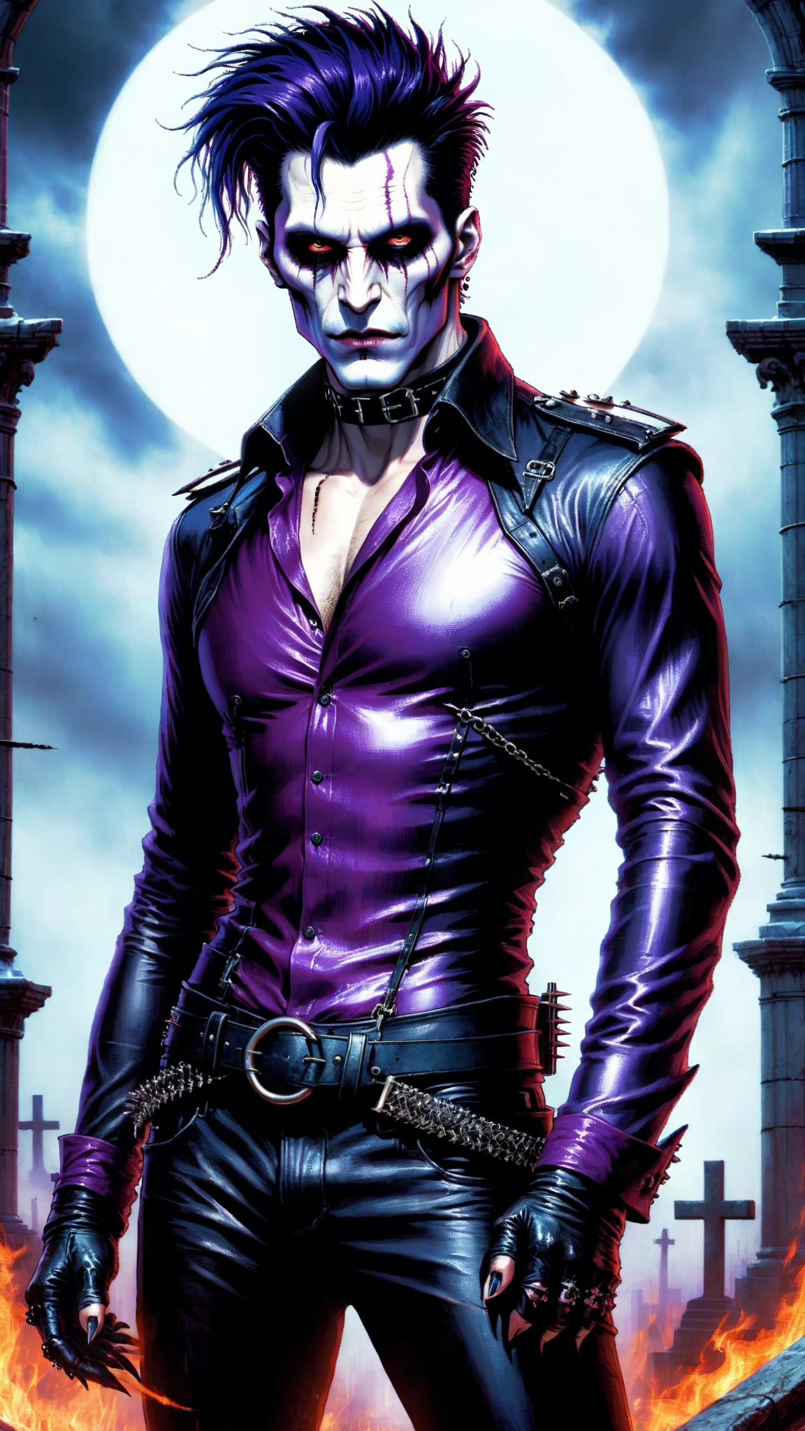 Goth Punk visits Hammer Horror films. Dark, creepy, Goth, sado-masochism. He can turn invisible and follow people around. He also has the ability to enter their minds and scare them to death. He can also siphon off little bits of life force and energy from his victims---most of the time he kills them. A young Caucasian man in his 20s, his skin is chalk white, he's becoming more undead as time goes by. He has dark circles around his eyes, but he also wears Goth makeup. Very tall, thin, lithe but strong, sinewy. Emo style hair, shaved on the sides and back, long on top and falls over one eye-- the top is dyed eggplant purple. Strong brow and jaw, masculine and handsome, though he does have a slight resemblance to Frankenstein's monster--- he takes pride in that. His eyes are grey and intense, like he's staring into your soul. Because he is tall, he has very big hands with long fingers. He wears the latest in Goth fashion: black leather choker collar with spikes, sheer black see-thru form fitting long sleeved shirt, o-ring black leather harness, black leather bracers with spikes on his arms, dark Violet leather jeans, heavy black leather engineer boots. Full body pose, hanging out in a graveyard or dark Goth Punk club.