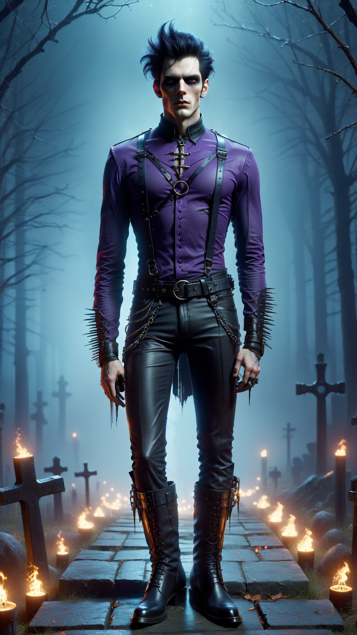 Goth Punk visits Hammer Horror films. Dark, creepy, Goth, sado-masochism. He can turn invisible and follow people around. He also has the ability to enter their minds and scare them to death. He can also siphon off little bits of life force and energy from his victims---most of the time he kills them. A young Caucasian man in his 20s, his skin is chalk white, he's becoming more undead as time goes by. He has dark circles around his eyes, but he also wears Goth makeup. Very tall, thin, lithe but strong, sinewy. Emo style hair, shaved on the sides and back, long on top and falls over one eye-- the top is dyed eggplant purple. Strong brow and jaw, masculine and handsome, though he does have a slight resemblance to Frankenstein's monster--- he takes pride in that. His eyes are grey and intense, like he's staring into your soul. Because he is tall, he has very big hands with long fingers. He wears the latest in Goth fashion: black leather choker collar with spikes, sheer black see-thru form fitting long sleeved shirt, o-ring black leather harness, black leather bracers with spikes on his arms, dark Violet leather jeans, heavy black leather engineer boots. Full body pose, hanging out in a graveyard or dark Goth Punk club.