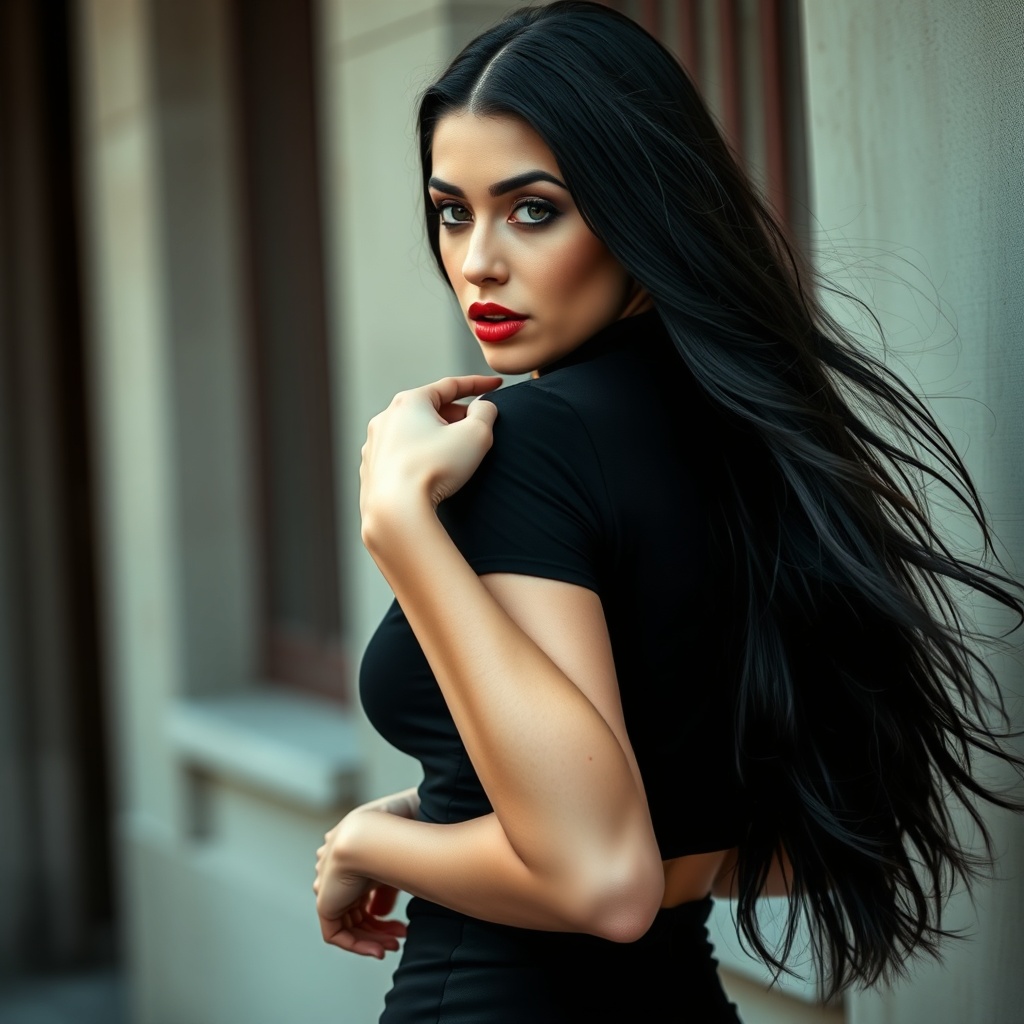 A striking goth woman with long, flowing black hair poses elegantly, wearing a stylish black top paired with a sleek black micro skirt. Captured using a Fujifilm X-T4 with a Sony FE 85mm lens, the image showcases a mood of dark allure with a vibrant, high-resolution finish. Her piercing gaze adds intensity to the composition, set against a softly blurred background that enhances the focus on her captivating presence and distinct fashion sense. The overall aesthetic maintains a balance between edgy gothic elements and refined elegance.