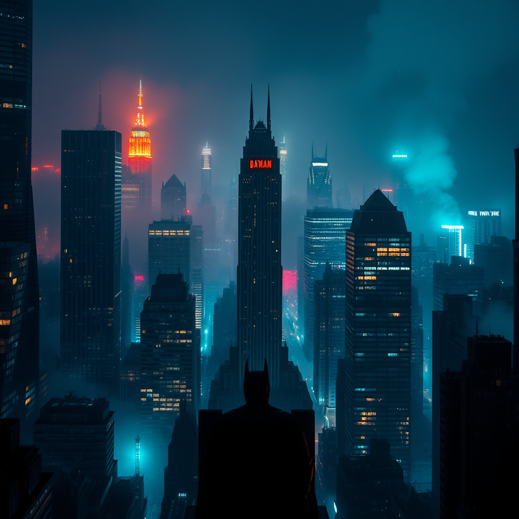 Gotham City at night, immersed in shadows, embodies the gritty realism and dramatic tension characteristic of a Christopher Nolan film. Batman stands as a solitary figure amidst a maze of towering skyscrapers, a beacon of justice cloaked in darkness. The atmosphere pulsates with suspense and lifesaving urgency, enveloped in a dynamic interplay of light and shadow that creates an eerie yet captivating spectacle. The scene is highly detailed, packed with hidden elements and subtle nods to the city's rich lore. This hyper-realistic tableau is rendered in vivid, colorful realism, capturing every nuance in UHD, 8K resolution, where each flicker of light and texture of the cityscape is palpable, amplifying the sense of chilling horror and dramatic heroism.