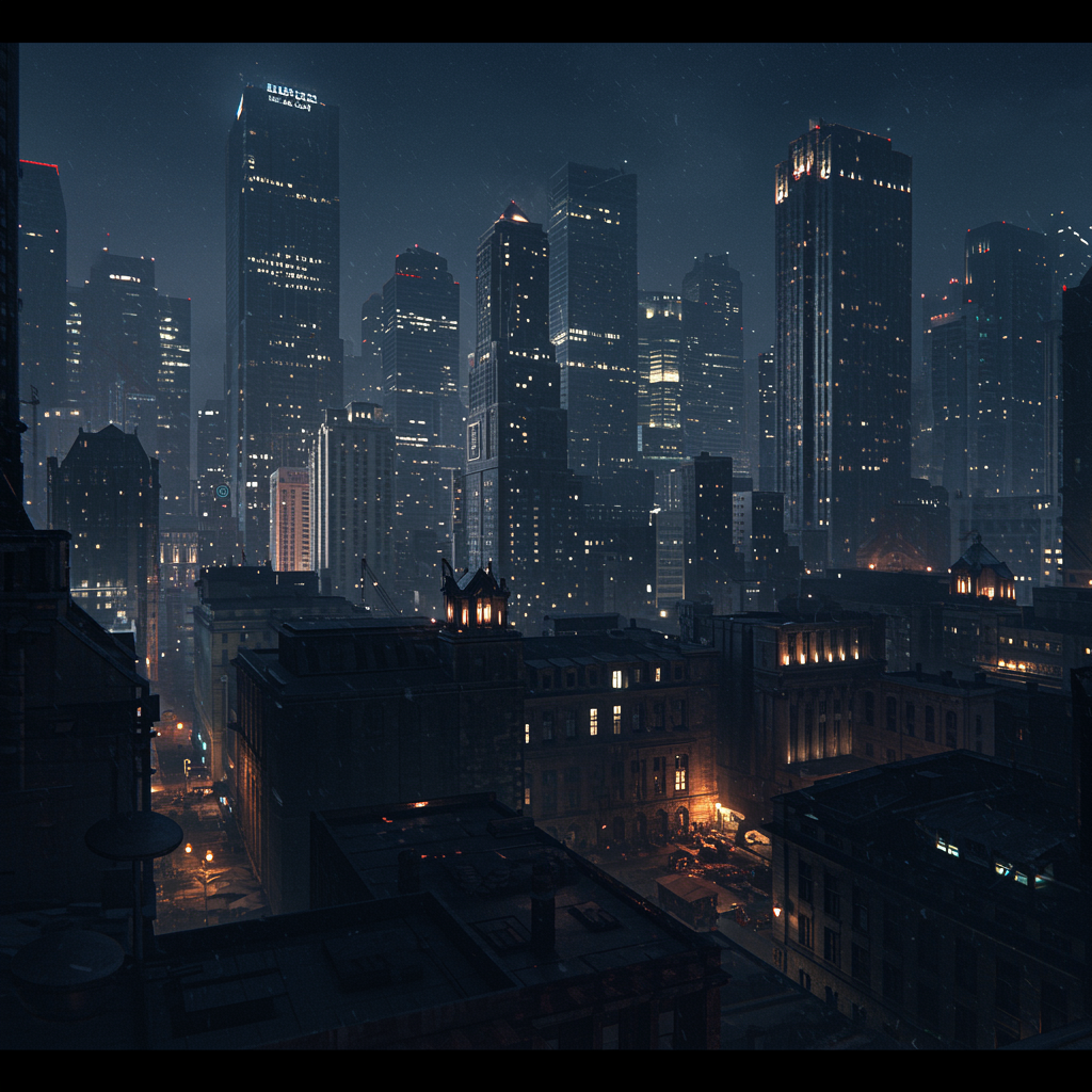 Gotham City skyline at night, cinematic vibe, 32k resolution, HD clarity, bustling nightlight scene, dramatic cinematic lighting with accent highlights, subtle translucence in illumination, meticulously detailed and intricate, ultra-maximalist design, sophisticated and ornate details, hyper-realistic portrayal, superlative detailing, capturing the city's grandeur and shadows, towering skyscrapers and winding streets, glowing reflections on glass facades, mysterious and alluring urban landscape, ambient shadows and light play, aspect ratio 9:16.