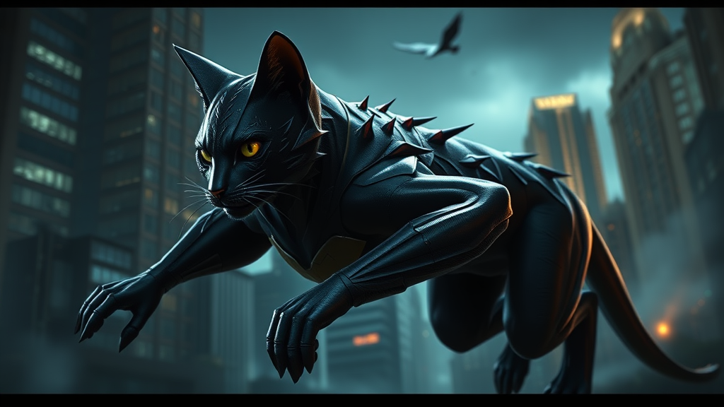 Gotham Feline Guardian, ultra-detailed, cinematic animation, 8k resolution, merging dark allure with sleek agility, shadowy cityscape backdrop, futuristic elements, capturing mysterious elegance and enigmatic charisma, a captivating blend of hero and feline grace.