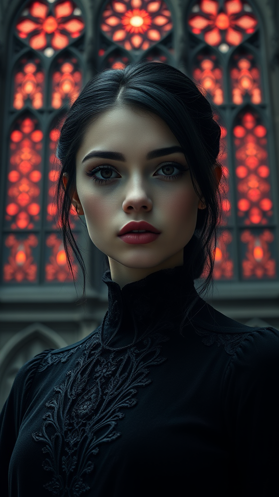 Gothic girl dressed in deep black attire, flawless face, macro headshot with a majestic gothic cathedral as the backdrop. The cathedral's windows reflect a mesmerizing glow of red flames, adorned with intricate, delicate mandala designs. Captured in stunning 8k UHD HDR. Model: Dark Sushi. The atmosphere is haunting yet beautiful, with a sense of mystery and elegance. Avoid any distortions such as duplicate or mutated features, ensuring a clear, focused image without any low resolution or distracting elements, maintaining the integrity and surreal beauty of the scene.