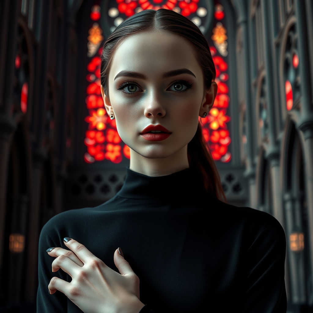 Gothic girl in black attire, flawless features, macro head shot, a grand gothic cathedral as the backdrop, perfectly captured, smooth lines, the cathedral windows aglow with reflections of red flames, intricate mandala-like designs, 8k resolution, UHD, HDR, Model: Dark Sushi 2.5D, symmetrical elegance, serene expression, elongated neck, gracefully posed hands, enhanced clarity, in focus, seamless composition, devoid of imperfections or digital artifacts.