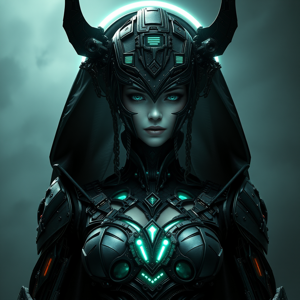 Gothic-inspired, a lone female warrior stands resolute with a mechanical battle-hardened exterior, her presence illuminated by a glowing mechanical halo. In this dark, digital fantasy world, her heads-up display flickers with ominous data, enhancing the sinister atmosphere. Her presence is intimidating, cloaked in mystery and haunting allure, adorned with dramatic, ornate details that merge seamlessly with high-tech elements. Her visage is a blend of darkly beautiful intricacy and technological prowess, casting an intimidating silhouette against the backdrop of a shadowy, digitally infused universe.