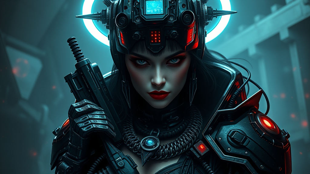 Gothic-inspired cybernetic warrior woman, exuding a mechanical battle-hardened aura, set against a shadowy digital fantasy landscape. Her imposing presence echoes sinister vibes, with an intimidating yet charismatic demeanor. She navigates this high-tech world with a heads-up display, enhancing her tactical prowess. Dark and mysterious, her appearance is hauntingly dramatic, with ornate and intricate details highlighting her formidable form. A mechanical, glowing halo encircles her head, casting an eerie luminescence. The overall ambiance is dark and enigmatic, richly layered with both gothic elegance and futuristic technology.