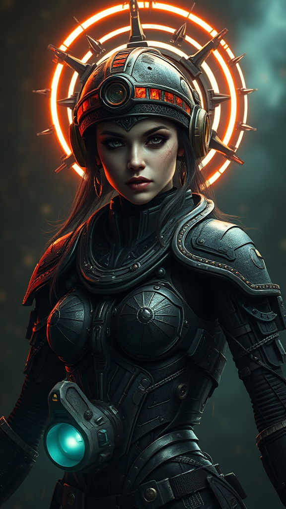 Gothic-inspired female warrior, battle-scarred and mechanical, with a sophisticated heads-up display, navigating a dark digital fantasy world. Her presence is both sinister and commanding, exuding an aura of intimidation. The atmosphere is dark and mysterious, with haunting and dramatic elements. Intricate and ornate details define her mechanical design, illuminated by a glowing halo that encircles her head, enhancing her enigmatic allure.