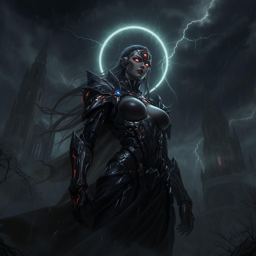 Gothic-inspired mechanical warrior woman, battle-hardened with a complex heads-up display in a dark, high-tech fantasy realm. Exudes sinister vibes and an intimidating presence, her figure is dark, mysterious, and haunting. Dramatically ornate and intricately detailed, she is adorned with a glowing mechanical halo around her head, casting an eerie, yet powerful aura. The setting is filled with a sense of foreboding, enhancing her enigmatic and commanding persona.