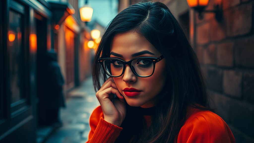 Gothic-inspired scene with a woman reminiscent of Velma from Scooby-Doo, adorned in dark eye makeup and stylish eye glasses. She wears an orange top that contrasts with her goth style mood, blending elements of kitsch and golden age aesthetics. The atmosphere evokes the artistic touch of Jessica Drossin, with the narrative flair of Kieron Gillen and the striking visuals of Dima Dmitriev. Life-size figures appear against a backdrop influenced by catcore fashion, creating a uniquely vivid and moody composition.