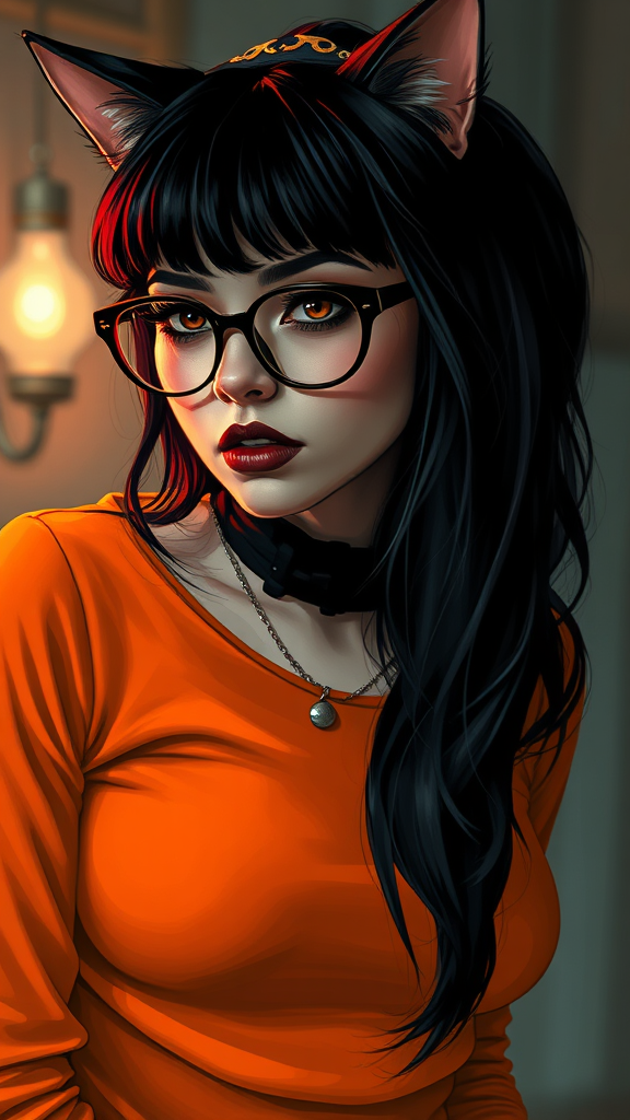 Gothic-inspired woman drawing inspiration from Velma of Scooby-Doo, dressed in an orange top with an edge of goth flair, donning eyeglasses, and exhibiting bold dark eye makeup. The atmosphere exudes a goth style mood, reminiscent of Jessica Drossin's ethereal touch, with a hint of kitsch and golden age aesthetics. Elements of Kieron Gillen's storytelling are woven in, complemented by striking life-size figures portrayed in Dima Dmitriev's vibrant style, all while embracing a playful catcore theme.