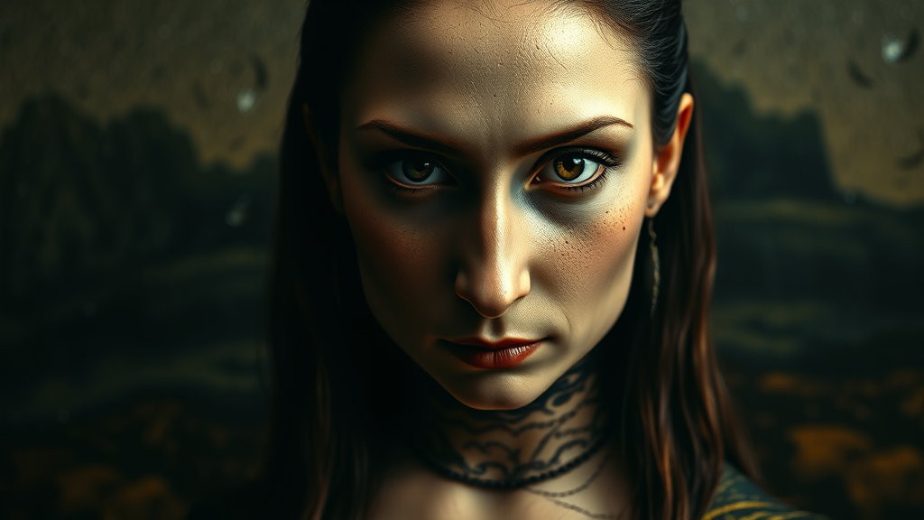 Gothic Mona Lisa envisioned by Tim Burton, highly cinematic and realistic, with intricate details, gazing intensely at the camera, infused with gothic and dark cinematic elements, moodily atmospheric, elongated proportions, high contrast shadows, muted colors, enigmatic expression, set against a foreboding and surreal background, evokes mystery and intrigue.