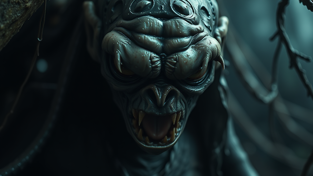 Gothic portrait of a sinister Gollum from J.R.R. Tolkien's Lord of the Rings, captured in a morbidly intricate style. The setting is brooding and densely atmospheric with a wet, glistening texture that heightens the eerie mood. The image is rendered with photorealistic precision in octane, showcasing hyper-detail with an epic, dramatic flair. The scene evokes the unsettling solitude of trail cam footage, as if peering into a forgotten, creepy realm. Masterfully captured by Irakli Nadar and Reylia Slaby, the frame invites the viewer into an empty, haunting world where dark elegance meets chilling intrigue.