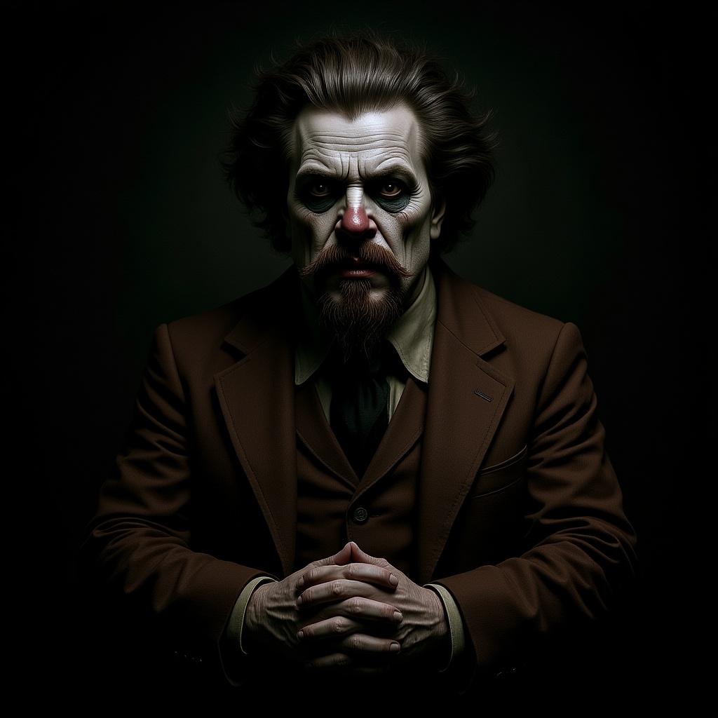 View this AI-generated image featuring gothic ronald mcdonald in an epic realistic portrayal featuring faded and neutral colors dramatic and intricate details conveying a cinematic quality with a focus on elaborate detailed design elements. Created using advanced AI technology, this image showcases
