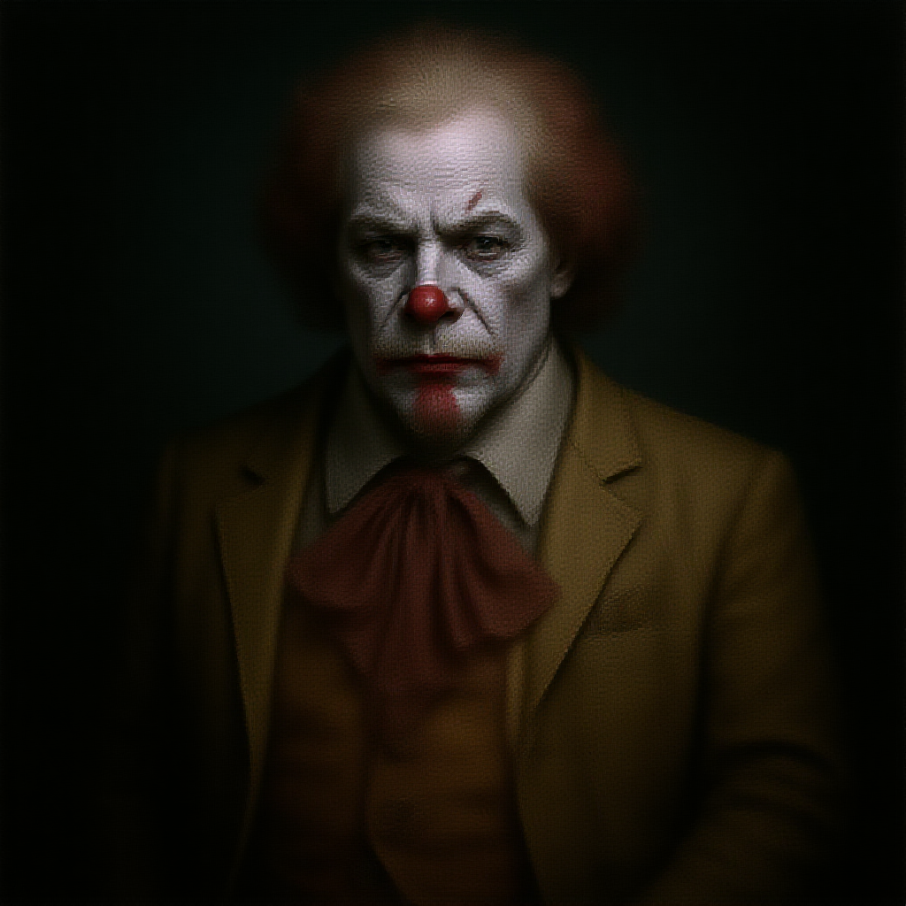 Gothic Ronald McDonald, epic realistic portrayal, featuring faded and neutral tones, dramatic elements with intricate and cinematic details throughout. A haunting yet sophisticated version of the iconic character, showcasing an intense gaze and elaborate costume design, embodying a fusion of whimsical charm and dark elegance.