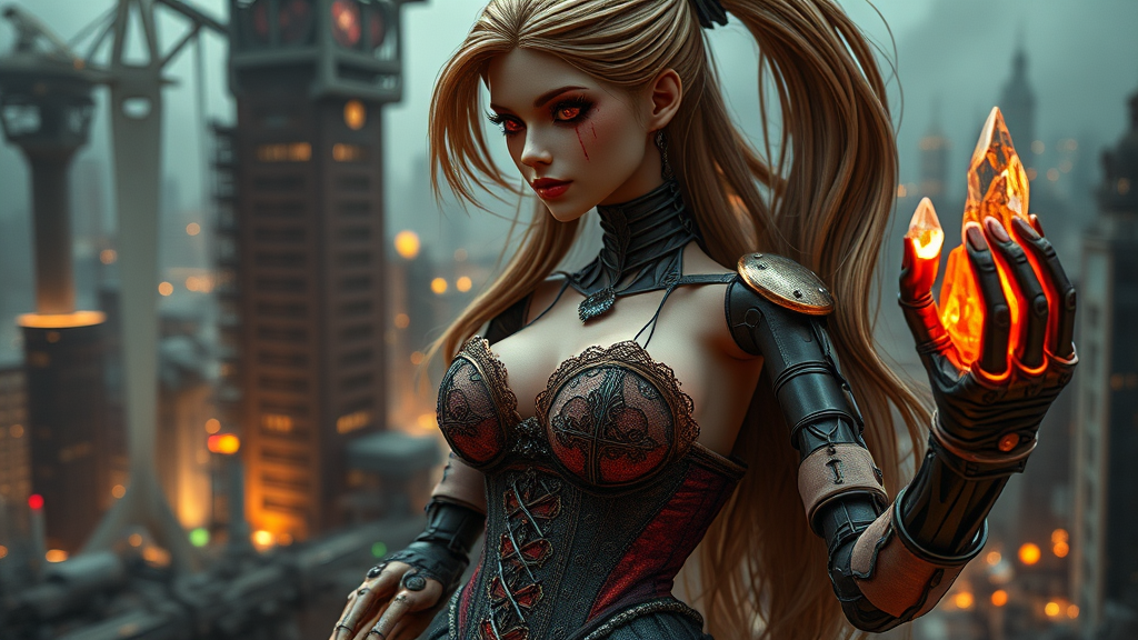 Gothic, steam-powered metropolis, ravaged by nuclear fallout, dreamlike, high-resolution, intricately detailed, well-groomed, long-haired doll, ponytailed, facial scars, tattered, lingerie visible beneath a tattered, ornate corset, cybernetic limbs, extra fingers, too many arms, rendered in vibrant octane colors, misplaced focus, defocused eyes, supple curves, wrinkled, discolored, weathered skin, burn scars, unsettling, gruesome, dark atmospheric lighting, a luminescent, crystal-tipped arm glows softly amidst the devastation, eerie, captivating.