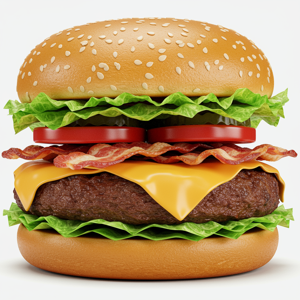 Gourmet cheeseburger with crispy bacon, fresh lettuce, juicy tomato, and melted cheese| high-definition promotional image| professional product photography| vibrant full-color| ultra-realistic render| irresistibly delicious
