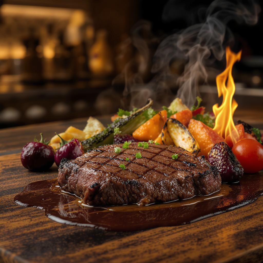 Gourmet culinary photography featuring succulent grilled beef and an array of vibrant grilled vegetables, captured in the opulent setting of a Michelin-star kitchen. The scene is illuminated with exquisite studio lighting, highlighting the intricate textures and colors, with an artistic depth of field that accentuates the richness and detail of each element, evoking an air of refined indulgence.