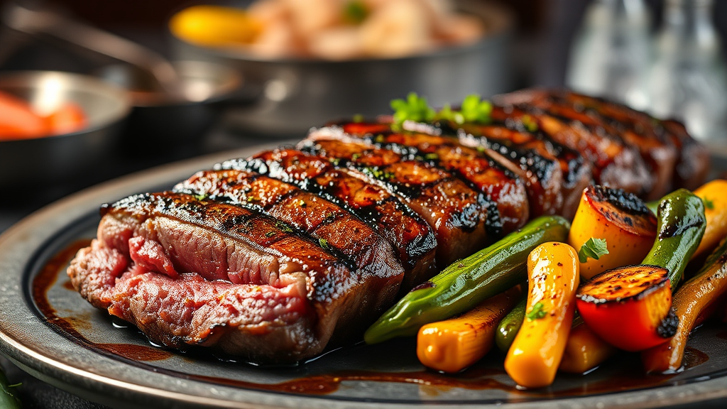 Gourmet culinary scene showcasing succulent grilled beef and vibrant grilled vegetables, captured with the elegance and precision of a Michelin-starred kitchen, utilizing exquisite studio lighting and a masterful depth of field to highlight ultra-fine details and textures.