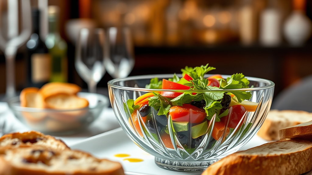 Gourmet food photography captures a vibrant vegetable salad elegantly presented in an exquisite crystal bowl, drizzled with rich olive oil, and accompanied by artisan bread, set in an opulent Michelin kitchen ambiance. The scene is expertly lit with studio lighting, showcasing intricate details and a masterful play of depth of field. Subtle uplighting enhances the natural colors and textures, while a close-up perspective offers an intimate view of the culinary artistry.