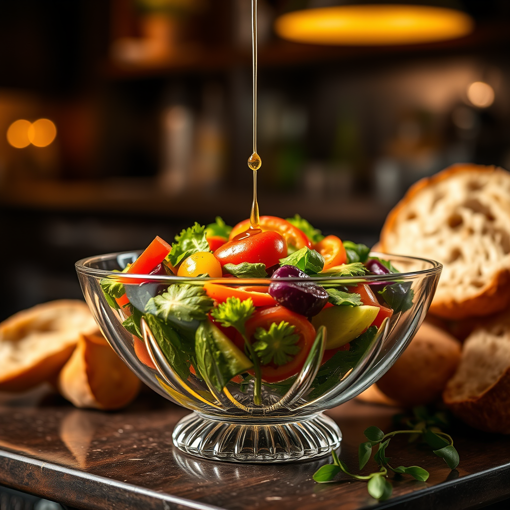 Gourmet food photography capturing a vibrant vegetable salad in an elegant crystal bowl, drizzled with premium olive oil, accompanied by artisanal bread, presented in a sophisticated Michelin-star kitchen ambiance. The scene is illuminated with studio lighting, enhancing depth of field and ultra-detailed textures. Soft uplighting highlights the salad's natural colors and features in a close-up perspective, exuding luxury and freshness.