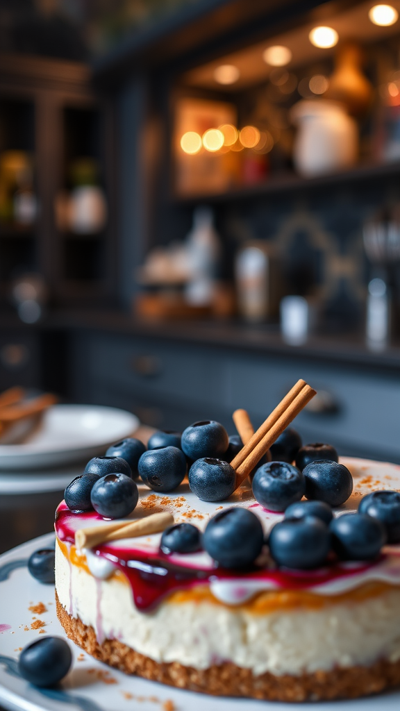 "Gourmet food photography capturing an exquisite cheesecake adorned with fresh blueberries and a hint of cinnamon, presented in a lavish Michelin-star kitchen setting, showcasing intricate details with a masterful play of depth of field, softly illuminated by uplighting that highlights its natural elegance and sophistication."