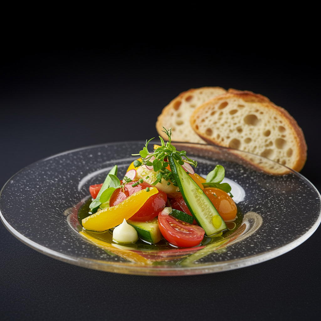 Gourmet food photography featuring a vibrant vegetable salad elegantly presented in a crystal-clear glass bowl, drizzled with premium olive oil and accompanied by artisanal bread, set in a lavish Michelin-starred kitchen environment; captured under sophisticated studio lighting with an emphasis on depth of field and ultra-fine details, incorporating uplighting to highlight natural textures and features in an intimate, close-up shot.
