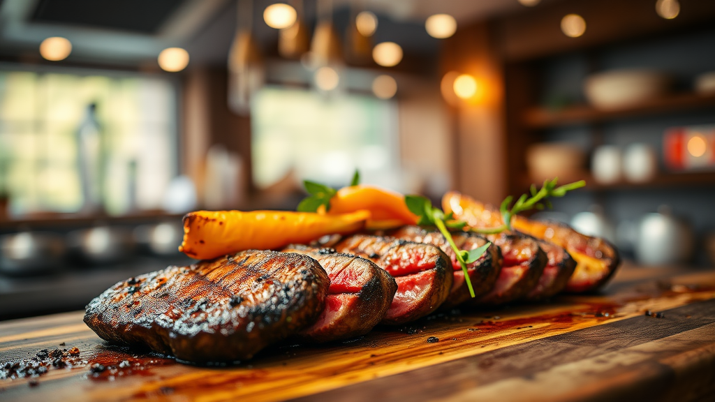 Gourmet food photography featuring succulent grilled beef and vibrant grilled vegetables, captured in an opulent Michelin star kitchen ambiance, enhanced by studio lighting, showcasing an exquisite depth of field and intricate details, evoking a sense of culinary artistry and refinement.