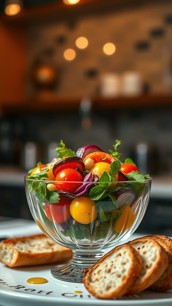 Gourmet food photography of a vibrant vegetable salad elegantly presented in a crystalline glass bowl, drizzled with premium olive oil, accompanied by artisanal bread, captured in the refined ambiance of a high-end Michelin-star kitchen, featuring exquisite studio lighting, a pronounced depth of field, showcasing ultra-fine details, subtly illuminated from below, highlighting natural textures, with a close-up perspective.
