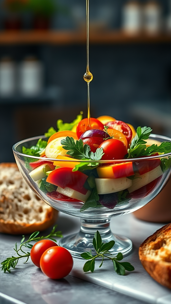 Gourmet food photography showcases a vibrant vegetable salad artfully arranged in an exquisite glass bowl. Drizzle of premium olive oil adds a gleam, accompanied by artisanal bread on the side. Captured in a luxurious, Michelin-starred kitchen style, the scene is illuminated with sophisticated studio lighting that enhances depth of field and highlights ultra-fine details. Subtle uplighting accentuates the salad's natural textures, all presented in an exquisite close-up shot.