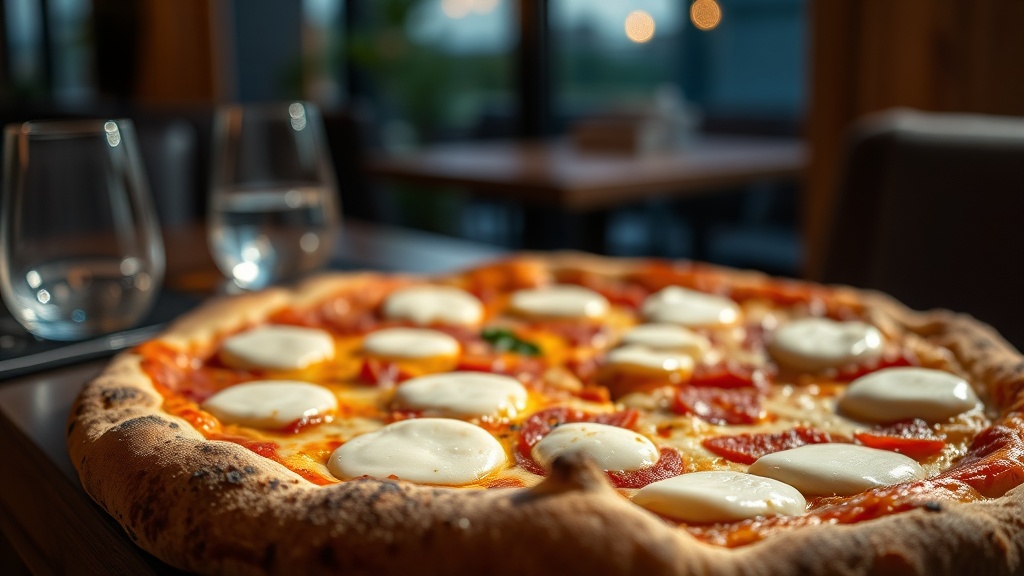 A tempting gourmet scene with a close-up of a golden-brown sourdough pizza lavished with extra mozzarella, captured with high-end food photography techniques. Luxurious and elegant in its presentation, the soft directional lighting casts dramatic shadows, enhancing the mouth-watering appeal of the dish. Shot with a Nikon Z7 at a focal length of 105mm, the composition is centered and clean, emphasizing the indulgent textures and rich details. Styled meticulously by a food stylist, the interior evening setting adds a warm, inviting glow that completes this exquisite culinary moment.