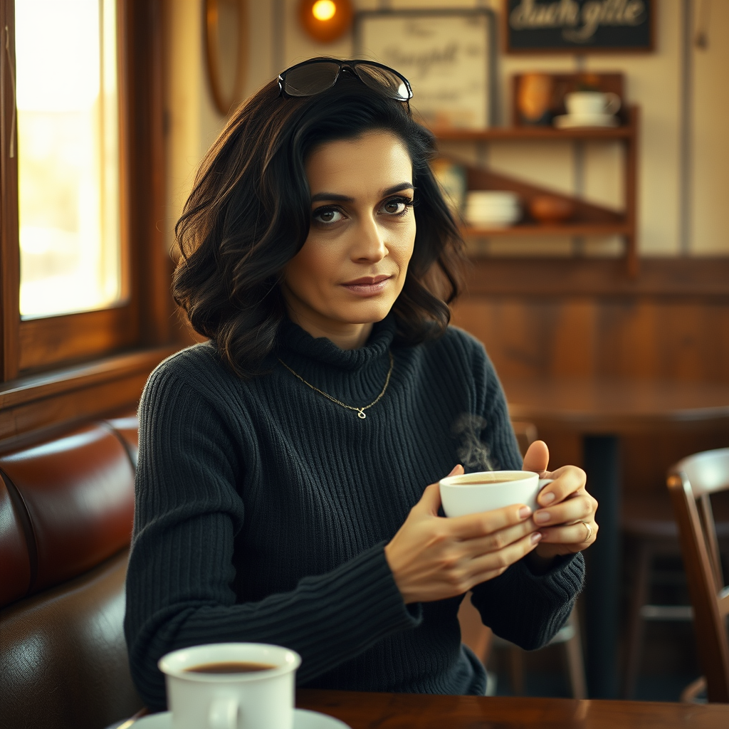 Gozde Seker, a 45-year-old woman with olive skin and dark, wavy hair, sits in a quaint coffee shop. She wears a snug, charcoal sweater dress and minimalist makeup, accentuated by a delicate, metallic choker. Her expression is serene as she cradles a steaming cup of coffee, her eyes a blend of tranquility and introspection. Warm, golden light filters through a window on her left, casting gentle shadows and emphasizing the rich textures of the wooden table and the retro, bohemian decor. The lighting evokes the charm of a Wes Anderson film, with a hint of film grain and a softly muted color palette, creating a dreamy, nostalgic ambiance.