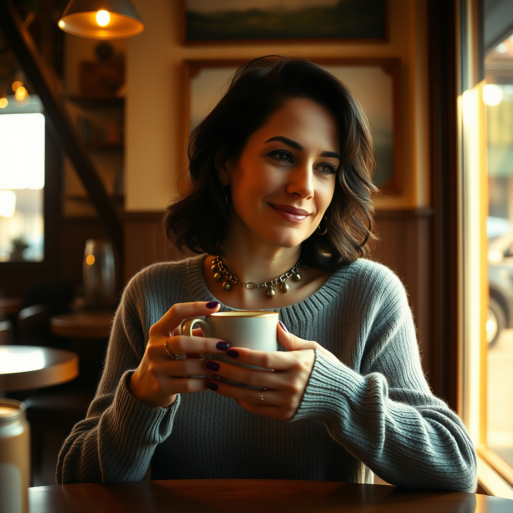 GozdeSeker, a 45-year-old woman with olive skin and dark, wavy hair, relaxes in a charming coffee shop. She wears a soft gray sweater dress, her makeup subtle, and an elegant metal choker around her neck. Her expression is peaceful as she cradles a steaming cup of coffee, her eyes reflecting a blend of satisfaction and contemplation. Warm, golden light filters through a window to her left, casting gentle shadows and illuminating the rich textures of the wooden table and the vintage-inspired decor. The scene evokes the style of a Wes Anderson film, with a soft film grain and slightly muted colors, creating a nostalgic and welcoming ambiance.