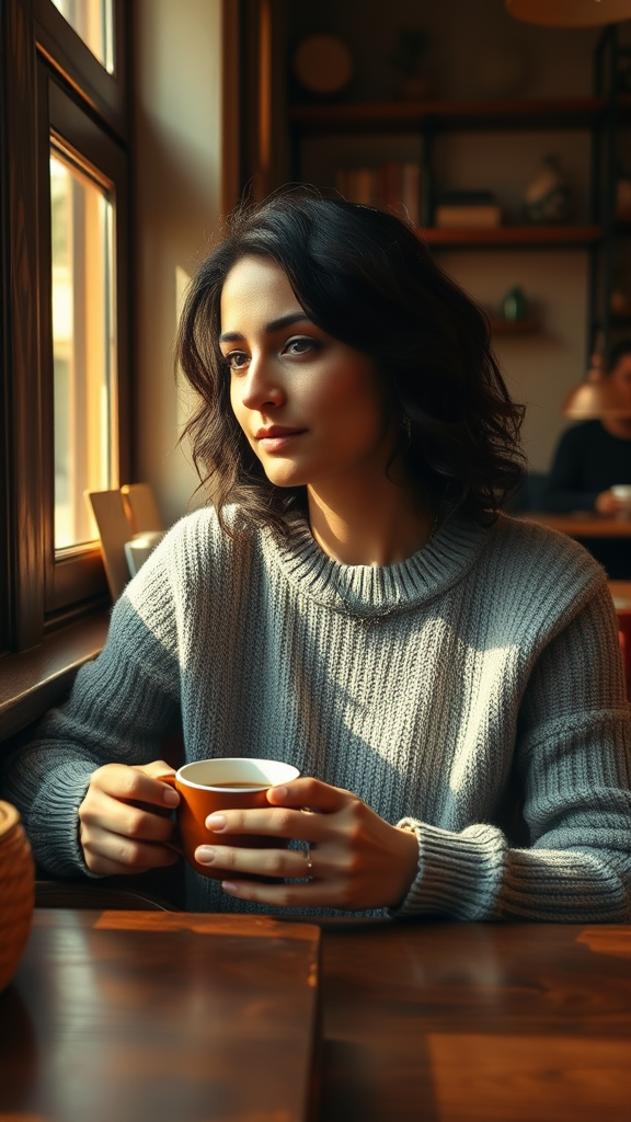 GozdeSeker, a 45-year-old woman with olive skin and dark, wavy hair, relaxes in a charming coffee shop. She is dressed in a cozy, dove-gray sweater dress and wears subtle makeup, accentuated by a delicate metal choker. Her serene expression complements her contemplative gaze as she holds a steaming cup of coffee. The scene is drenched in warm, amber light filtering in from a window to her left, creating gentle shadows and accentuating the rich textures of the vintage wooden table and eclectic decor. The setting exudes a nostalgic charm reminiscent of a Wes Anderson film, with a soft film grain and slightly muted colors, inviting a sense of warmth and introspection.