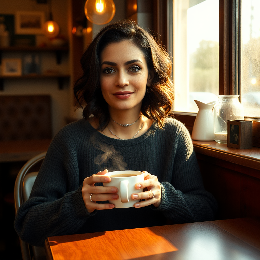 GozdeSeker, a 45-year-old woman with radiant olive skin and dark, wavy hair, relaxes in a quaint coffee shop. She is dressed in a snug, charcoal sweater dress, accented by subtle makeup and a minimalist silver choker, exuding an air of understated elegance. Her serene expression is complemented by the steaming cup of coffee she cradles, her eyes reflecting a blend of contentment and introspection. The warm, golden light streaming from a nearby window bathes the scene, casting gentle shadows and enhancing the rich textures of the wooden table and the eclectic, vintage decor. The ambiance evokes the signature style of a Wes Anderson film, with a subtle film grain and a gently muted color palette, creating a nostalgic and inviting atmosphere.