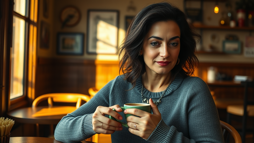 GozdeSeker, a 45-year-old woman with sun-kissed olive skin and dark, wavy hair, relaxes in a quaint coffee shop. She dons an elegant gray sweater dress, with understated makeup and a delicate, minimalist silver choker. Her expression is calm and reflective as she cradles a steaming cup of coffee, her eyes a blend of contentment and introspection. The scene is illuminated by soft, golden light streaming in from a window to her left, casting gentle shadows and accentuating the rich textures of the wooden table and vintage-inspired decor. The lighting, akin to a Wes Anderson film, bathes the scene in a warm glow with subtle film grain and a slightly muted color palette, evoking a sense of nostalgia and comfort.