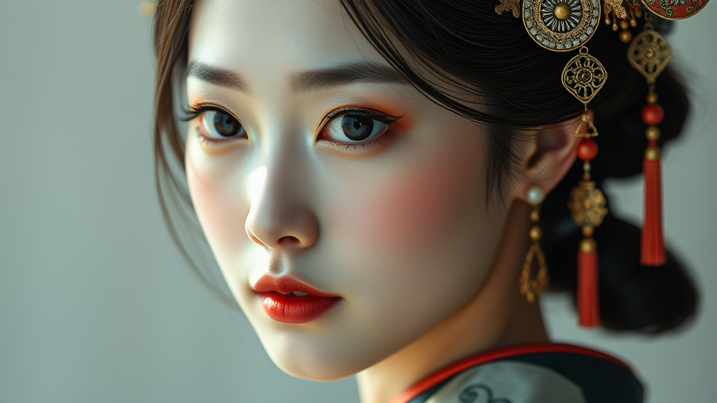 Graceful Asian woman, porcelain skin, immaculate and luminous, otherworldly beauty, monolid eyes dark and profound, mesmerizing gaze, eyeliner highlights their charm, elegantly arched eyebrows convey gentle emotions, Rose-tinted lips are delicately hued, Silk kimonos and intricate hair ornaments enhance her captivating presence, RAW portrait, expert photography, high resolution, 4k, maintaining a harmonious composition while subtly altering negative aspects for improved visual appeal.