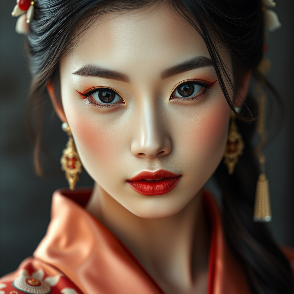 Graceful Asian woman, radiant porcelain complexion, impeccable and luminous, otherworldly charm, monolid eyes deep and mesmerizing, entrancing gaze, eyeliner highlights their elegance, gently arched eyebrows express delicate emotions, Lips like cherries, subtly hued, Silk kimonos and exquisite hair ornaments enhance her captivating presence, RAW portrait, expert photography, high definition, 4k.