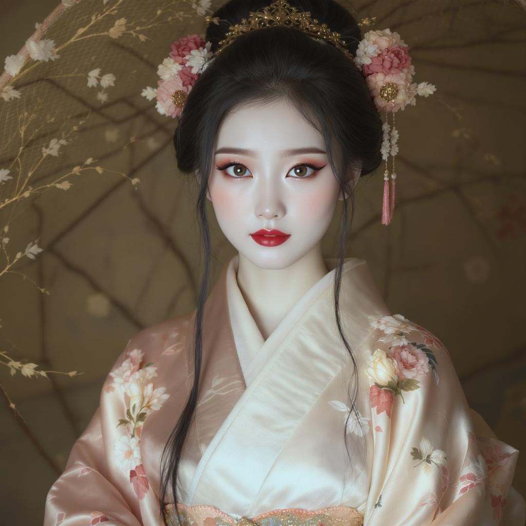 Graceful Asian woman with luminous porcelain skin, capturing an air of ethereal beauty, monolid eyes dark and profound, holding a captivating gaze; eyeliner highlights their mysterious allure. Softly arched eyebrows express delicate emotions, and cherry lips are gently tinted. Draped in elegant silk kimonos and adorned with intricate hairpieces, her enchanting presence is enhanced. RAW portrait, expertly crafted photography, high resolution, 4k.