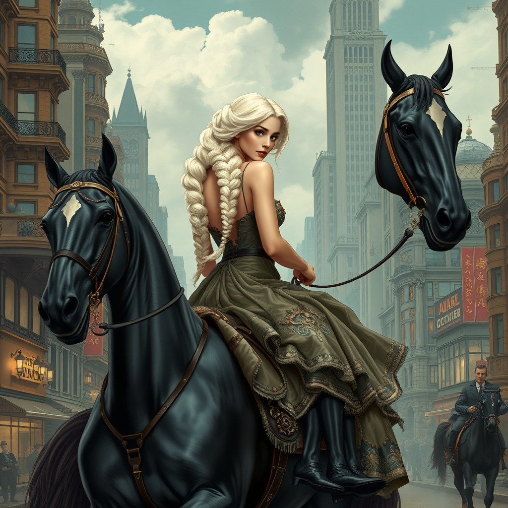 Graceful full-height portrait of a stunning Lady Godiva with an opulent, flowing ivory braid, adorned in a meticulously crafted mini dress, astride a majestic, large-scale ebony horse. She rides through an intricately detailed steampunk cityscape, capturing the essence of a bygone era with modern flair. The scene exudes intricacies and depth, showcasing a polished, sharp focus that highlights every nuance. Inspired by the art styles of Ruan Jia, Ilya Kuvshinov, Alphonse Mucha, and Ross Draws, the image merges elegance with a fantastical ambiance, embodied in smooth lines and vivid storytelling elements.
