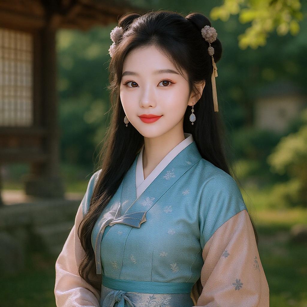 View this AI-generated image featuring graceful and elegant korean woman radiating beauty charm and confidence adorned in traditional attire surrounded by serene nature with soft sunlight enhancing her features captivating all with her poise and presence. Created using advanced AI technology, this i