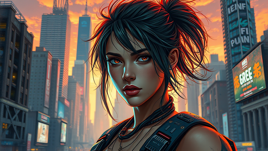 graffiti tagged, street grunge style portrait of a young and determined cyberpunk woman with messy long hair and a revolutionary spirit, riot gear adorned with circuit boards and wires, set against the vibrant and chaotic backdrop of a megacity at sunset, with crumbling skyscrapers and holographic advertisements, painted in a stylized and high-detail digital art reminiscent of Mike Winkelmann, expressive and emotive with subtle texture and noise, showcasing the grit and rebellion of this cyberpunk heroine as she rises up against the oppressive forces of the city, her face a blur of determination and defiance.