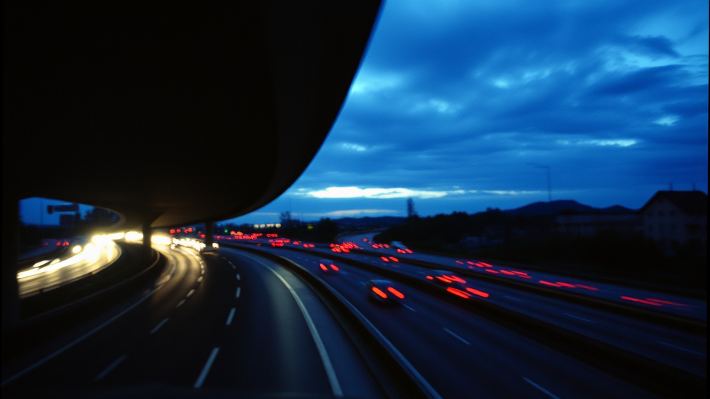 Grainy 35mm film photo capturing a busy highway from an overpass during the blue hour, headlights and taillights streaked in a soft blur of motion, creating a cinematic aura with a moody, atmospheric sky overhead.