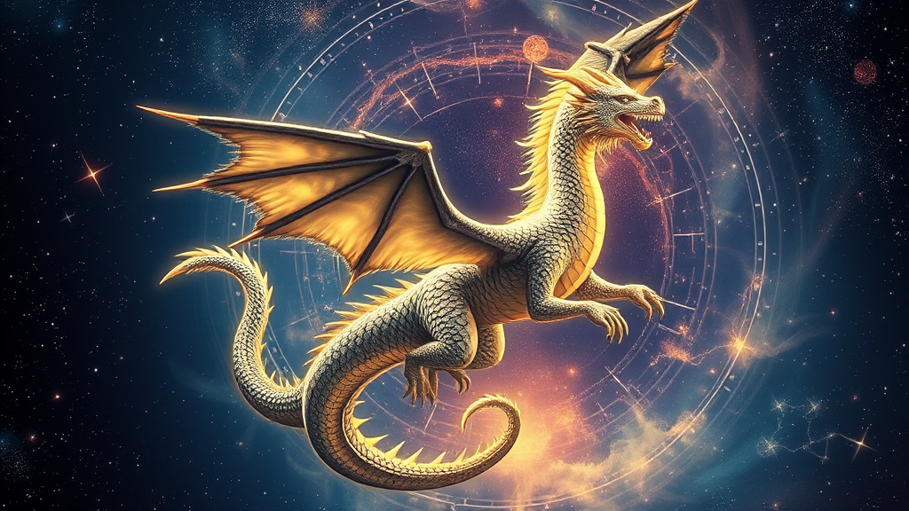 GranderendrealmspacemassivedragonAurelionSol soaring through depths of cosmic starlight; an enigma of magic spiraling within the zodiac constellations' embrace in background.