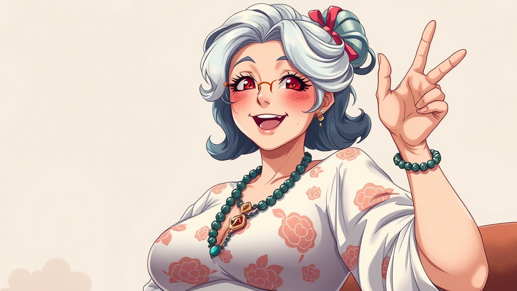 Grandma, expressive pose, anime waifu vibes - charmingly flirtatious body language, strong-curvaceous figure, stunningly beautiful face, in the style of lifelike and highly detailed illustrations, cute, digital sculpting finesse, ultra-realistic painting, nuanced shading.